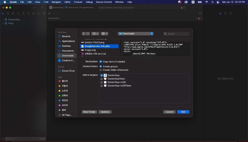 우선 위의 GoogleService-Info.plist 파일을 Xcode를 사용해서 ios/{ProjectName}/ 경로로 옮기면 된다. 아래의 이미지를 따라가면 된다.