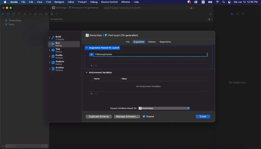 Firbase Analytics는 약 30분 ~ 1시간 동안 취합한 데이터를 보여준다. 하지만 개발 중에는 그렇게까지 시간을 소요할 수 없으므로 DebugView를 사용한다. 아래의 이미지를 순서대로 따라하고, -FIRDebugEnabled를 추가해주면된다. 이렇게 개발된 부분의 확인은 Firebase Analytics의 DebugView 메뉴에서 확인할 수 있다.
