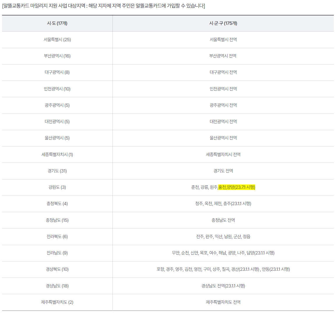 국가 단위로 거의 모든 지자체에서 진행하는 사업이다보니 대중교통을 많이 이용하는 지역인데 아래에 포함되지 않는 경우는 거의 없을 거에요! 아래에서 한 번 확인해보세요!