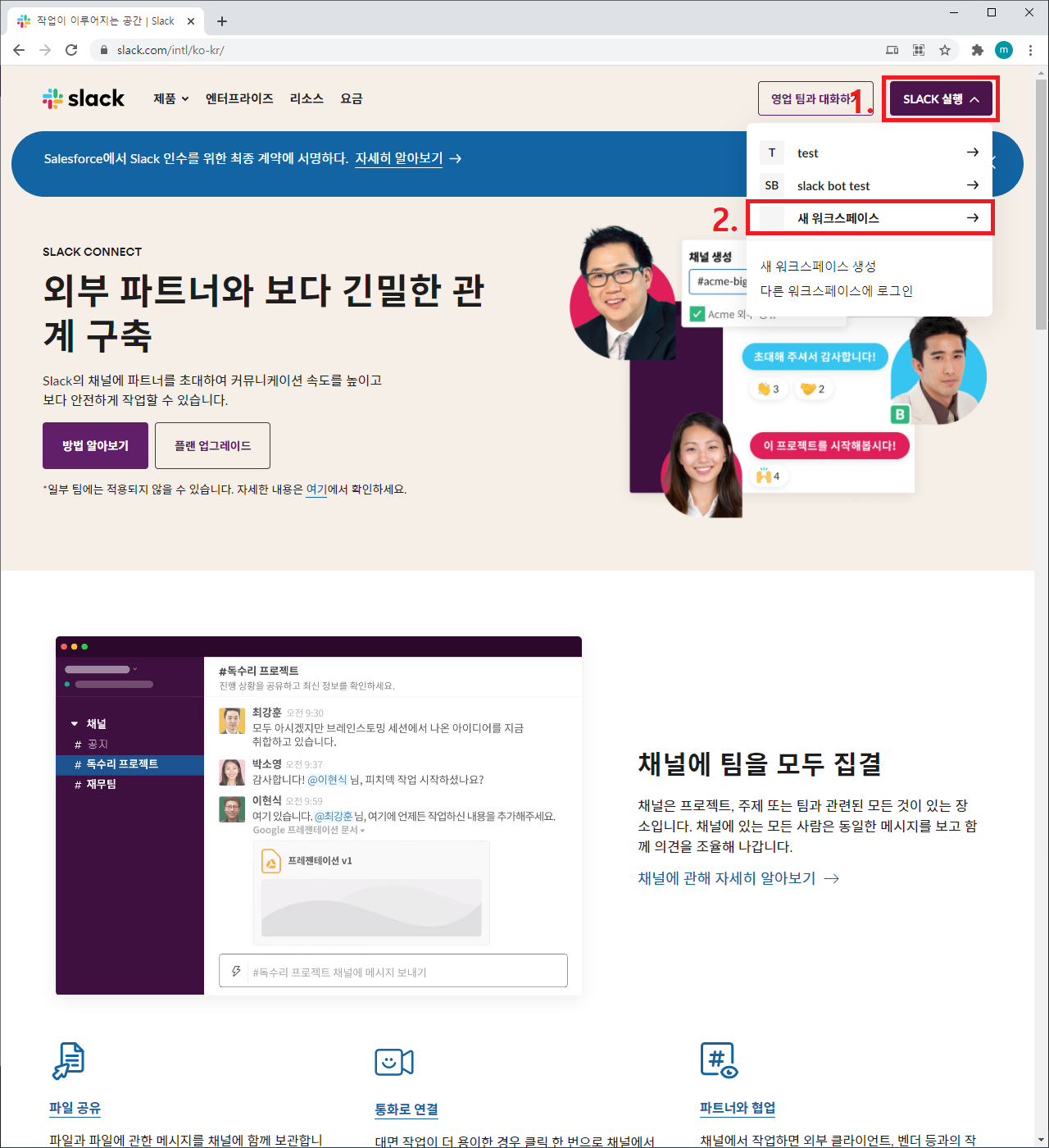 첫 번째로 할 일은 알림봇을 설정할 워크스페이스를 생성하는 것이다. slack.com/intl/ko-kr/로 접속해서 로그인 후 아래의 그림과 같이 새 워크스페이스를 생성한다.