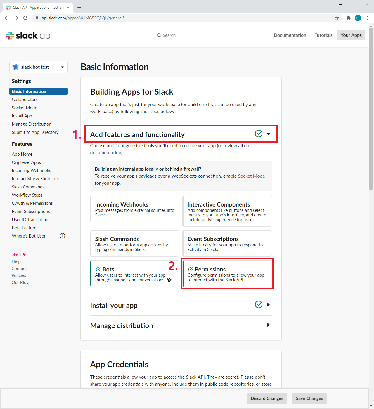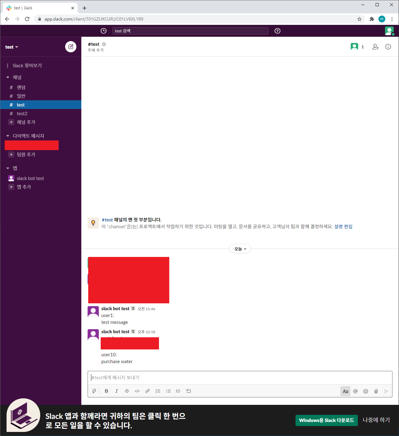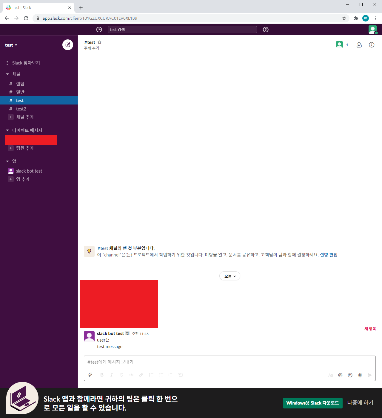 생성 시에 워크스페이스 명은 slack bot test로 진행하고, 채널 명은 test로 만들도록 하자.