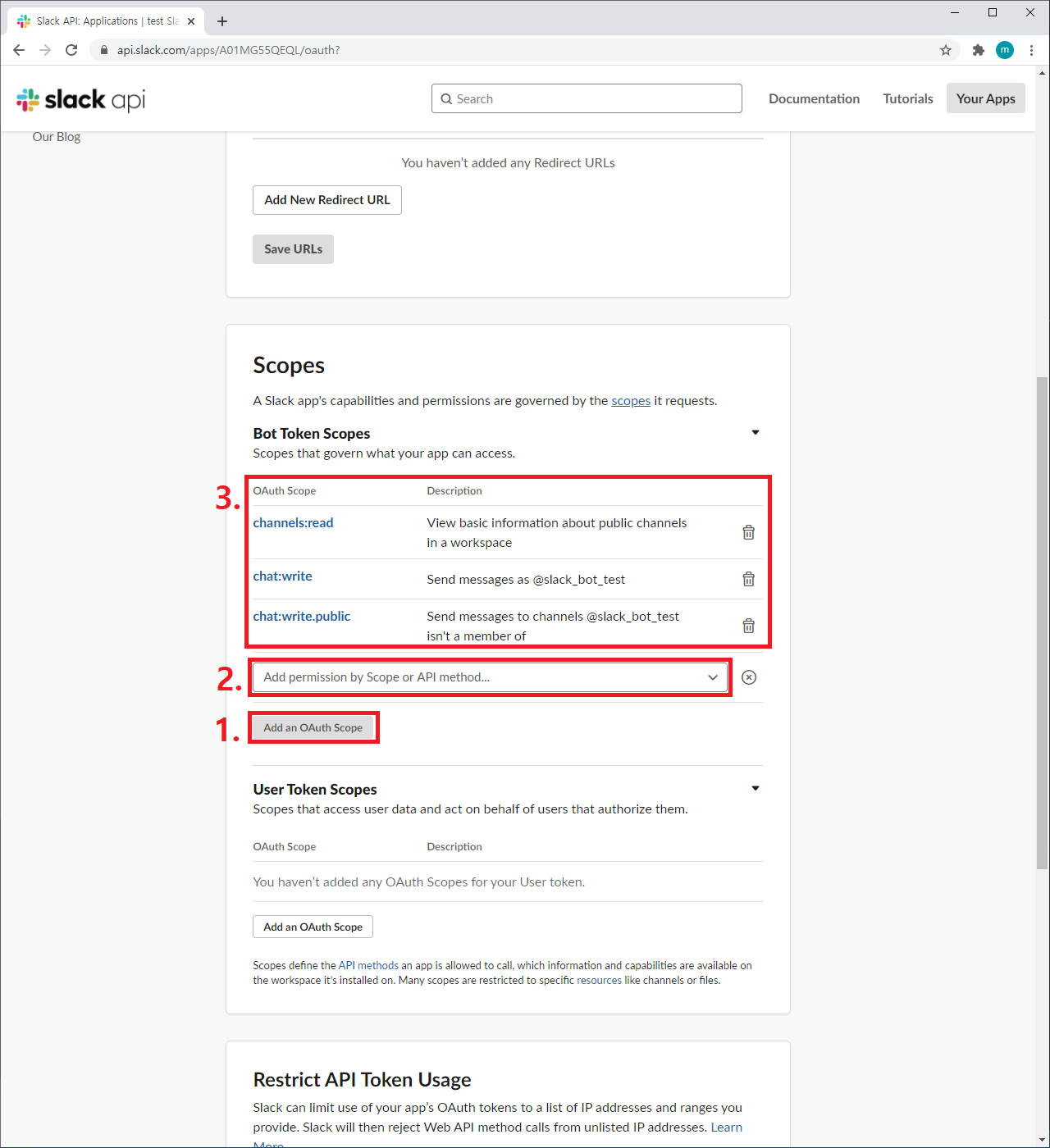 아래의 Add an OAuth Scope 버튼을 클릭해서 channels:read, chat:write,chat:write.public을 모두 허용한다.
