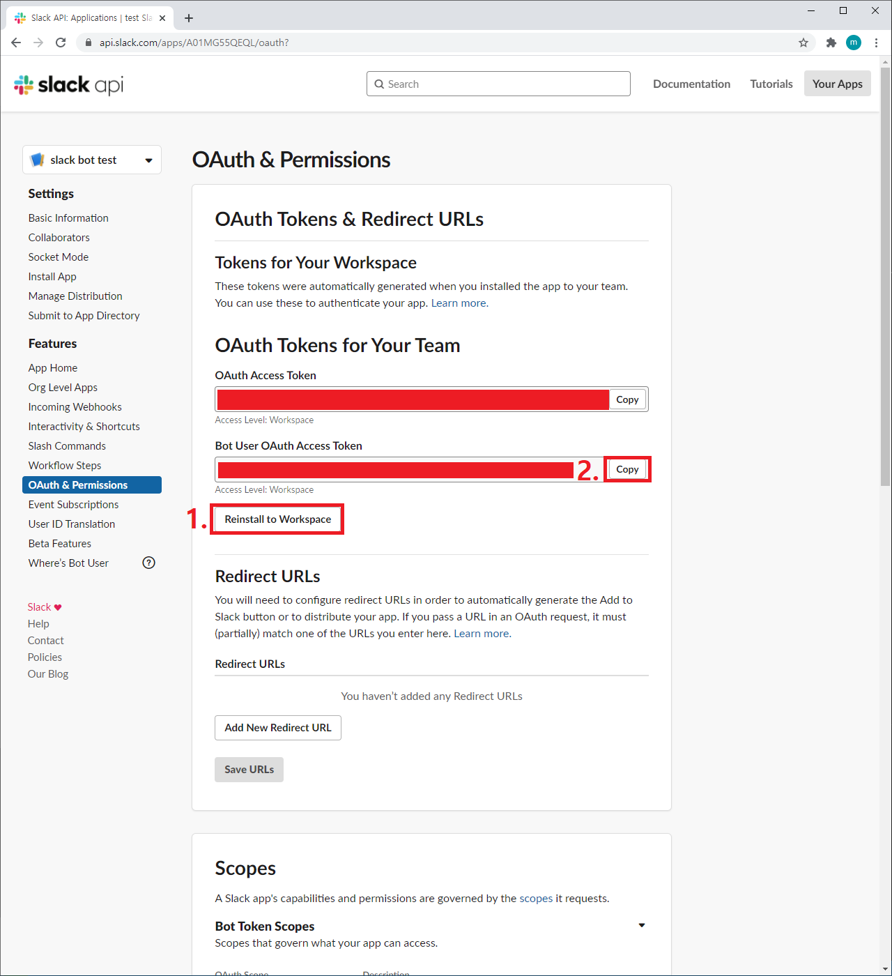 아래의 내용을 수정했으면 반드시 install 또는 reinstall을 해야 한다. 그 후에 우리가 앞으로 사용할 토큰을 복사해두면 된다. 우리가 사용할 token은 Bot User OAuth Access Token이다.