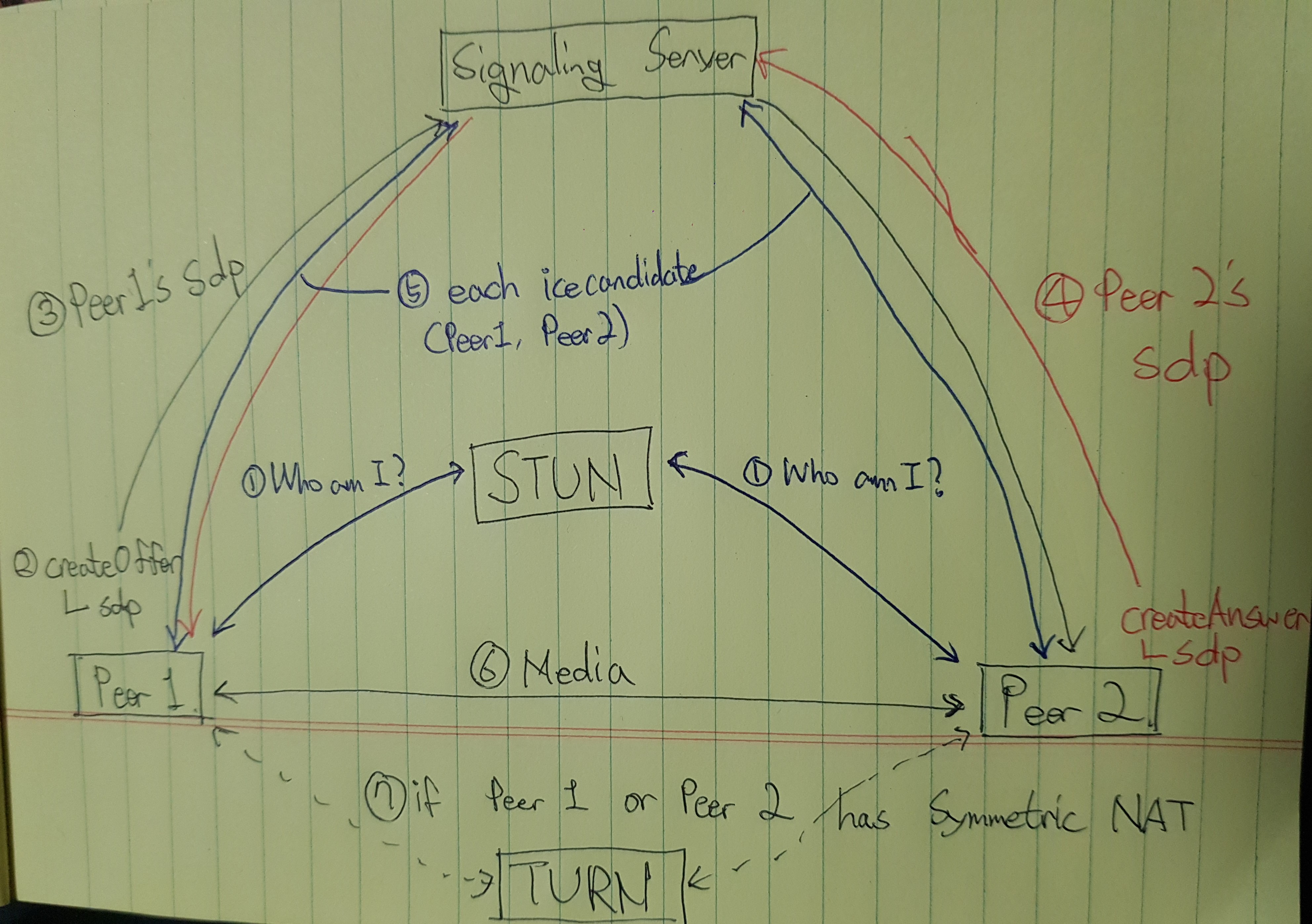 아래의 그림은 위의 그림들에서 실제 Signaling 서버를 통해 주고 받는 데이터가 분명하게 그려져 있지는 않아 이해를 돕기 위해 글쓴이가 직접 그렸다. 위의 그림들에서 peer의 NAT이 STUN 서버에게 어떤 요청을 보내는지는 설명했기 때문에 직접 그린 그림에서는 NAT 부분 그림을 제외시켰다.(실제로는 peer에 각각 NAT이 존재한다.) 해당 그림의 순서는 글쓴이가 직접 client와 signaling server에 log를 찍어가며 직접 확인한 부분이다.(혹시 잘못된 부분이 있다면 댓글로 설명해주시면 바로 수정하겠습니다!)